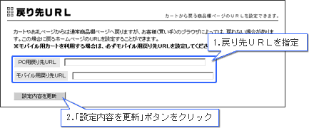 PC用とモバイル用の戻り先URLを入力して[設定内容を更新]ボタンをクリックします。